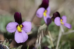 A small perennial violet native to the Pacific Northwest, notable for its basal rosette of leathery leaves with three prominent veins and bicolored flowers.