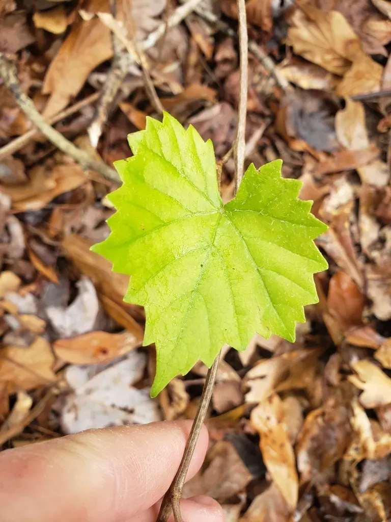 Vitis vulpina is a high-climbing woody vine native to North America, known for its thick trunk and red tendrils.