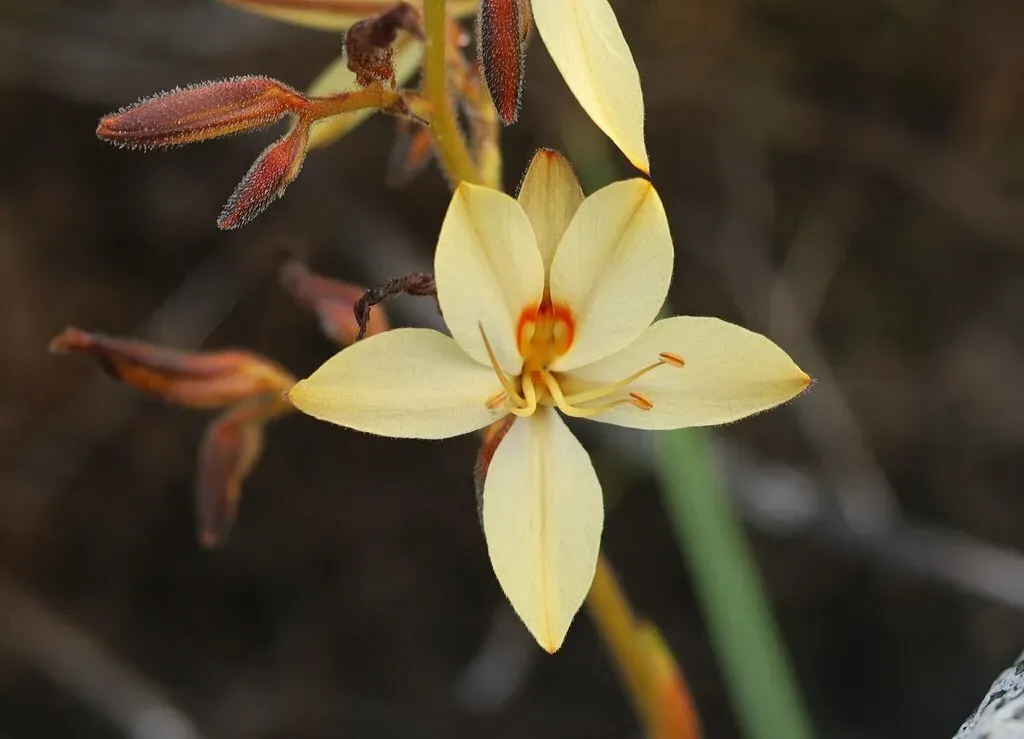 Wachendorfia paniculata is a tuberous geophyte native to the Cape Province of South Africa, growing 10–90 cm tall with basal tufts of long, narrow, pleated leaves and erect spikes of starry yellow to apricot flowers.