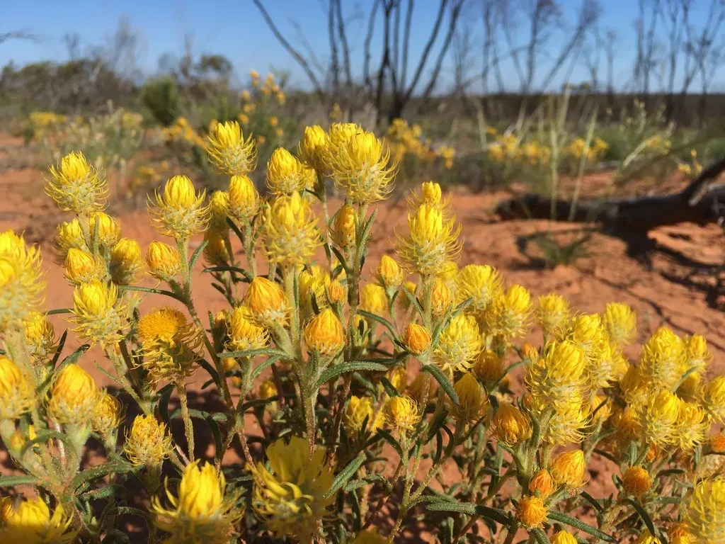 Waitzia acuminata is an erect or ascending annual herb native to Australia, growing between 0.1 and 0.6 meters tall with narrow leaves and bright flowers.