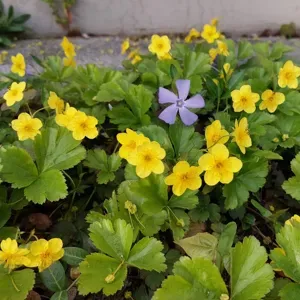 A low-growing, mat-forming perennial groundcover with glossy, evergreen, trifoliate leaves and bright yellow, strawberry-like flowers in spring.