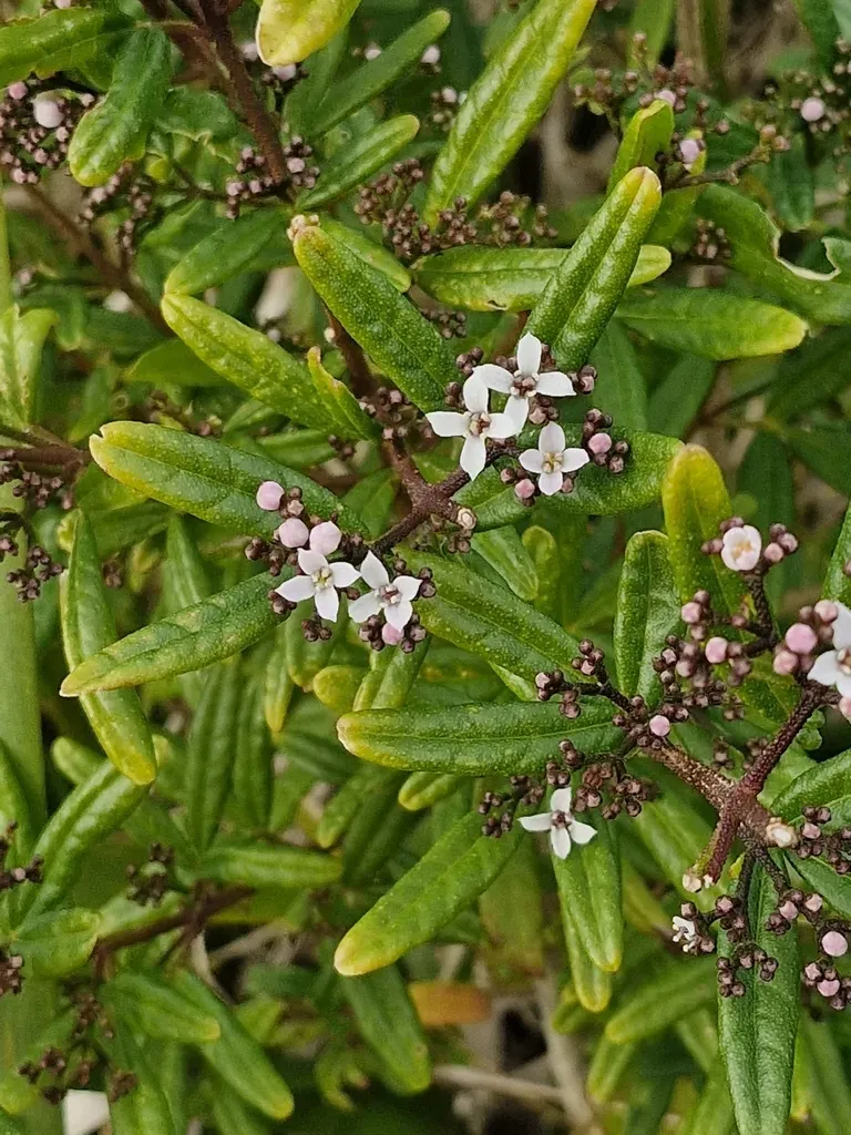 Zieria smithii is an evergreen shrub native to Australia, known for its trifoliate leaves and clusters of small white flowers.