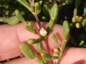 Zygophyllum qatarense is a salt-tolerant dwarf shrub native to the Arabian Peninsula, particularly found in Qatar and Saudi Arabia. It thrives in arid and saline desert environments.